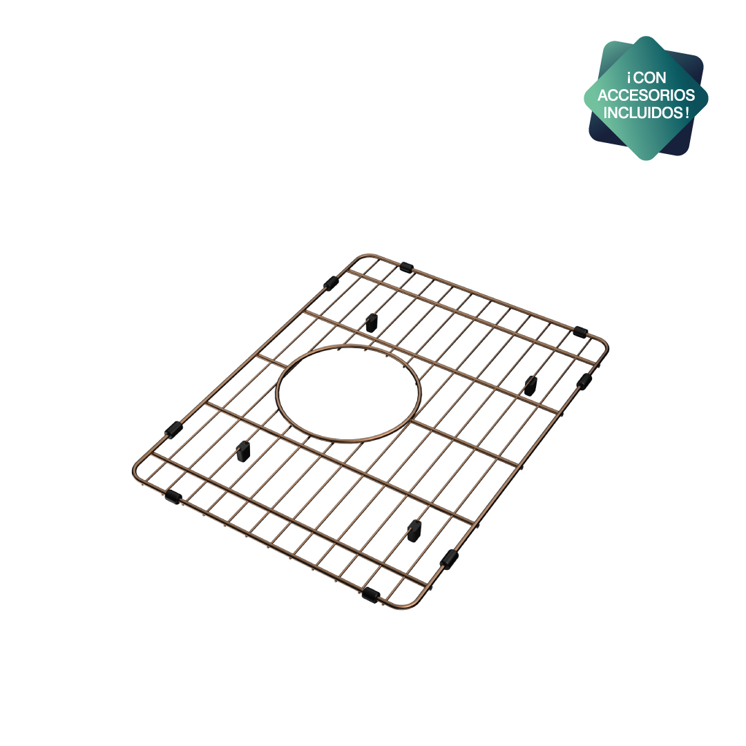 Eleva los platos para mejorar el desagüe y proteger la superficie de la pileta. Posee apoyos de silicona que resguardan el fondo de la misma. Este accesorio, con su elegante acabado Rose Gold Nano PVD, está disponible exclusivamente para modelos con esta terminación.